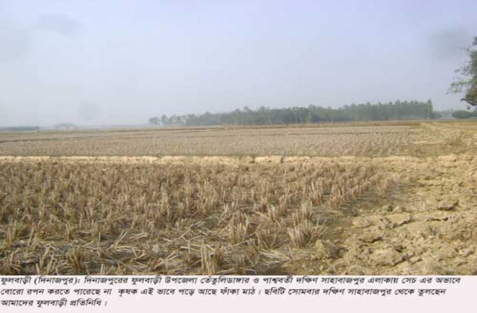 গতকাল সোমবার সরজমিনে গিয়ে দেখা যায় সেচের অভাবে মাঠের পর মাঠ পড়ে আছে। কৃষকরা জানান সেচের অভাবে তারা বোরো রোপন করতে পারছে না। এদিকে বীজ চারার রোপনের বয়স পেরিয়ে যাচ্ছে। একই সাথে বোরো রোপনের মৌসুমও শেষ হয়ে যাচ্ছে।