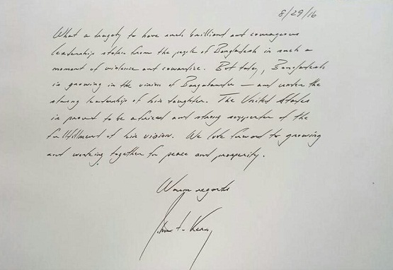 বাংলাদেশে দ্রুত উন্নয়নের পথে এগিয়ে যাচ্ছে বলেও মনে করেন জন কেরি। আর এই উন্নয়নে প্রধানমন্ত্রী শেখ হাসিনার নেতৃত্বেরও ভূয়সী প্রসংশা করেন তিনি। কেরি লিখেন, ‘তারই (বঙ্গবন্ধু) কন্যার দৃঢ় নেতৃত্বে গড়ে উঠছে বঙ্গবন্ধুর স্বপ্নের বাংলাদেশ। আর যুক্তরাষ্ট্র এই অগ্রগতির সঙ্গে সম্পৃক্ত থাকতে পারা ও বন্ধুত্বপূর্ণ সম্পর্ক রাখতে পেরে গর্বিত। বাংলাদেশের শান্তি ও অগ্রগতির জন্য আমরা আরও নিবিঢ়ভাবে কাজ করতে চাই।’