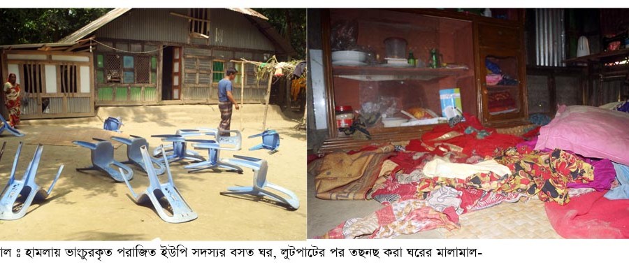 বরিশাল প্রতিনিধি: ইউনিয়ন পরিষদ নির্বাচনে পরাজিত ইউপি সদস্যর বাড়িতে বুধবার সকালে প্রকাশ্যে অস্ত্রের মহড়া নিয়ে হামলা চালিয়ে দুটি বসত ঘর, একটি ব্যবসায়ীক প্রতিষ্ঠান ভাংচুর ও লুটপাট করেছে বিজয়ী ইউপি সদস্য ও তার সমর্থকেরা। এসময় হামলায় নারীসহ কমপক্ষে ১০জন আহত হয়েছে। গুরুতর আহতদের হাসপাতালে ভর্তি করা হয়। ঘটনাটি ঘটেছে জেলার গৌরনদী ্উপজেলার নলচিড়া ইউনিয়নের ১নং ওয়ার্ড দক্ষিণ পিঙ্গলাকাঠী (হাজ্বীপাড়া) গ্রামে।