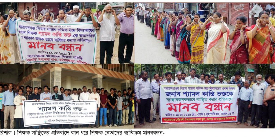 বরিশালে শিক্ষকদের কান ধরে ব্যতিক্রম প্রতিবাদ