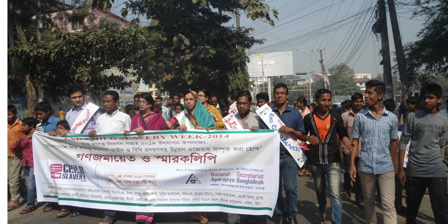 বাংলাদেশে ১৮ বৎসরের নীচে অসংখ্য শিশু পরিবারের দারিদ্রতা ও অসহায়ত্বের কারনে হোটেল-রেঁস্তোরা, বাস-টেম্পু, কল-কারখানা (গার্মেন্টস, চিমনী ফ্যাক্টরী, জামদানী পল্লী), এ্যলুমুনিয়াম ফ্যাক্টারী, মৎস্য ঘের, শুটকি, গৃহকর্মসহ ইত্যাদি ঝুঁকিপূর্ণ শ্রমে নিয়োজিত আছে। যা প্রকারান্তে আধুনিক দাসত্বমূলক পর্যায়ে পর্যভূষিত হয়েছে। পারিবারিক কলহ, পিতা-মাতার মৃত্যু বা অন্যত্র বিবাহে শিশুরা অভিভাবকহীনতায় দাস ও পথশিশুতে পরিণত হচ্ছে। এ শিশুরাই মাদক বিপণন ও আসক্তের পাশাপাশি পাচারের শিকার ও পতিতাবৃত্তিতে বাধ্য হচ্ছে। সর্বোপরি পরিবার, সমাজ বা রাষ্ট্রের সংবেদনশীল পরিকল্পনা ও কর্মসূিচর অভাবে শিশুরা এই পরিস্থিতি থেকে মুক্ত হতে পারছে না। আইএলও-এর এক জরিপ অনুযায়ী বিশ্বে প্রায় ৫.৫ মিলিয়ন শিশু জোরপূর্বক শ্রমদানে ব্যবহৃত হচ্ছে, যার ৮৫% শিশু ঝুঁকিপূর্ণ কাজে নিয়োজিত। প্রকৃত সংখ্যা আরো বেশীও হতে পারে এবং প্রতিনিয়ত বৃদ্ধি পাচ্ছে। সমগ্র বিশ্বের লক্ষ লক্ষ শিশু ভয়াবহ নির্যাতনের শিকার, বিশ্বের রাষ্ট্রসমূহ শিশু সুরক্ষায় ব্যর্থ হচ্ছে। এ পরিস্থিতিতে বাংলাদেশে শিশুর অমানবিক পরিস্থিতি থেকে রক্ষায় শিশু দাসত্ব নিরসনে পূর্ণাঙ্গ আইন ও বিধিমালা প্রনয়ন, শিশুর সামাজিক নিরাপত্তার লক্ষ্যে জাতীয় উন্নয়ন কর্মসূচী গ্রহণ করাসহ সামাজিক উদ্দ্যোগ গ্রহণে উৎসাহিত করা; সারা দেশব্যাপী গণমাধ্যম ও বিভিন্ন সামাজিক স্বেচ্ছাসেবী প্রতিষ্ঠানসহ ব্যক্তিকে শিশু দাসত্ব নিরসনে সক্রিয় করার শিশু দাসত্ব নিরসনে আইন ও বিধি প্রনয়ণসহ সরকারের চলমান উন্নয়ন এজেন্ডায় সম্পৃক্ত করার দাবী জানিয়েছেন চট্টগ্রামে কর্মরত বেসরকারী উন্নয়ন সংগঠন ও নাগরিক সমাজের প্রতিনিধিবৃন্দ। ২৪ নভেম্বর ২০১৪ বিশ্বব্যাপী ২০-২৬ নভেম্বর’২০১৪ শিশু দাসত্ব নিরসন সপ্তাহ উদযাপন উপলক্ষে নগরীর চট্টগ্রামের জেলা পরিষদ চত্বরে চট্টগ্রাম বিভাগীয় শিশু দাসত্ব নিরসন সপ্তাহ উদযাপন পর্ষদের পক্ষ থেকে আয়োজিত গণজমায়েত এ উপরোক্ত দাবী জানানো হয়।
