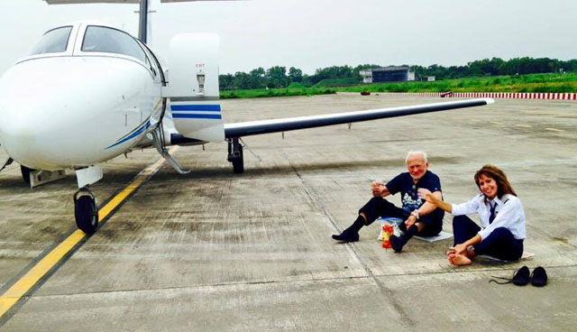 ছবির ক্যাপশনে তিনি লিখেছেন, “আমার সঙ্গী ক্যাপ্টেন জুডি রাইসের বিশ্বব্যাপী শিক্ষা ছড়িয়ে দেওয়ার ক্যাম্পেইন ‘থিংক গ্লোবাল ফ্লাইট’ এর অংশ হিসেবে ঘুরছি। পরবর্তী শহরে যাওয়ার অনুমতি মেলার মাঝের সময়টাতে টারমাকে বসে পিকনিক করে নিলাম।”