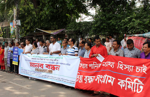 মানববন্ধনে জল-জলা ও কৃষি জমি রক্ষা সংগ্রাম কমিটির আহ্বায়ক ফরিদুর ইসলাম ফিরোজ সভাপতির বক্তব্যে বলেন, ‘আন্তর্জাতিক আইন ও রীতি অনুযায়ী নদীর পানি ব্যবহারে বিভিন্ন চুক্তি ও নীতিমালা ভারত অনবরত অমান্য করে চলছে। তারা এসব নদীর উপর একতরফাভাবে বিভিন্ন প্রকার ড্যাম, ব্যারেজ ও বিদ্যু প্রকল্প গড়ে তুলছে। আমরা তা প্রত্যাহারের দাবি জানাচ্ছি।’