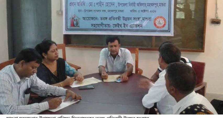 স্বেচ্ছাসেবী সংস্থা ফেইথ ইন এ্যাকশনের সহযোগিতায় তরঙ্গ প্রতিবন্ধী উন্নয়ন সংস্থা এ সভার আয়োজন করে । সভায় তরঙ্গ প্রতিবন্ধী উন্নয়ন সংস্থার সভাপতি রান œুশেখের সভাপতিত্বে প্রধান অতিথি ছিলেন মহম্মদপুর সদর উপজেলা নির্বাহী অফিসার মো: শাহীন হোসেন ।