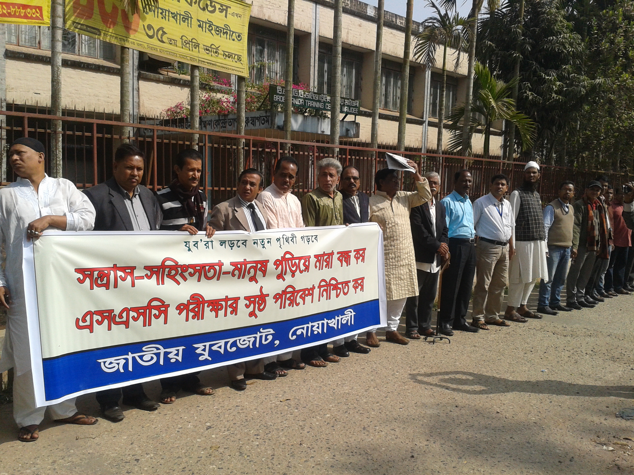 দেশব্যাপী সন্ত্রাস-সহিংসতা-মানুষ পুড়িয়ে মারার প্রতিবাদে ও এসএসপি পরীক্ষার সুষ্ঠ পরিবেশ নিশ্চিত করার দাবিতে নোয়াখালীতে কেন্দ্রীয় কর্মসূচির অংশ হিসেবে জাতীয় যুবজোটের উদ্যোগে মানববন্ধন ও প্রতিবাদ সমাবেশ অনুষ্ঠিত হয়েছে।