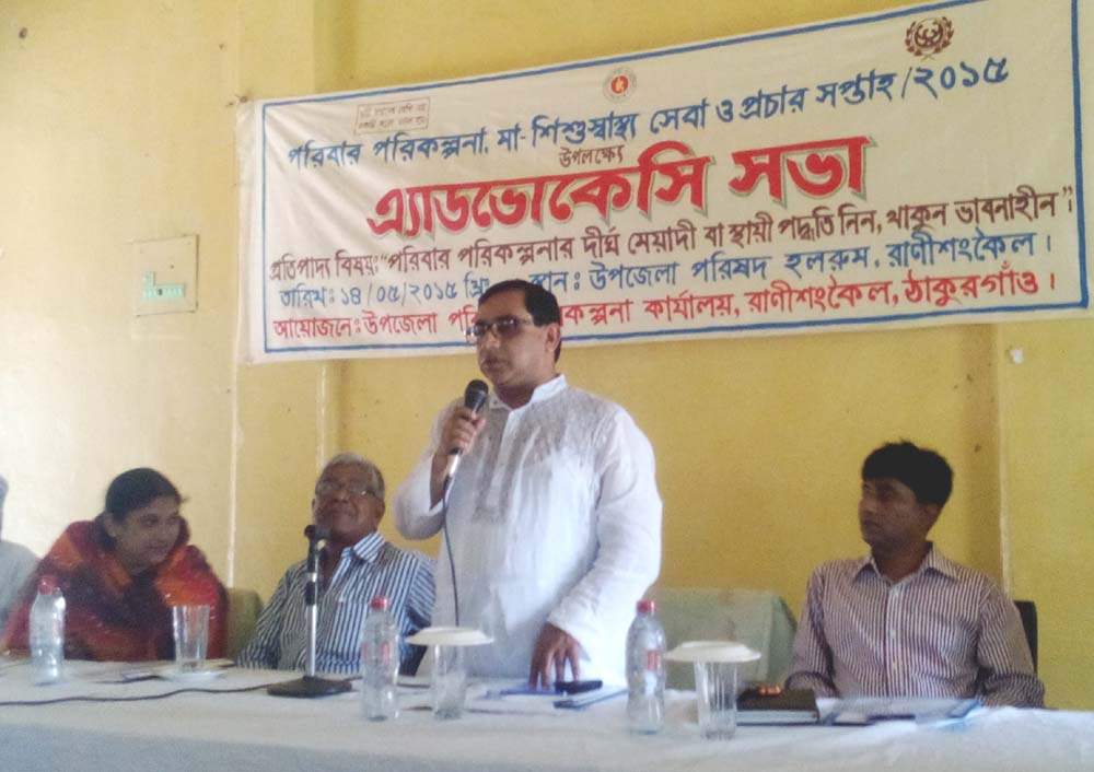 ঠাকুরগাঁওয়ের রানীশংকৈল উপজেলা পরিবার পরিকল্পনা কার্যালয়ের আয়োজনে ১৪ মে সকাল ১০ টায় উপজেলা হলরূমে উপজেলা নির্বাহী অফিসার আশরাফুল ইসলামের সভাপতিত্বে পরিবার পরিকল্পনা মা, শিশু স্বাস্থ্য সেবা প্রচার সপ্তাহের এ্যাডভোকেসি আলোচনা সভা অনুষ্ঠিত হয়।