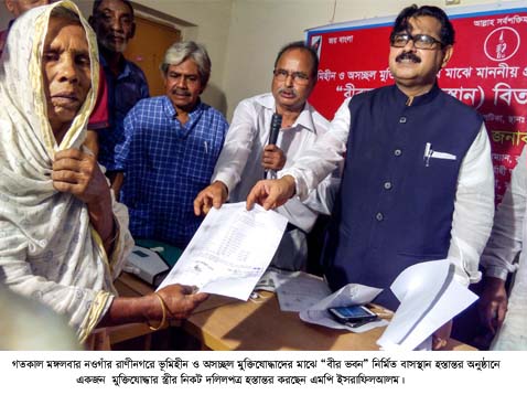 কাজী আনিছুর রহমান, রাণীনগর (নওগাঁ) সংবাদদাতা : নওগাঁ-৬ (রাণীনগর-আত্রাই) আসনের সংসদ সদস্য ইসরাফিল আলম এমপি বলেছেন, ১৯৭১ সালে জাতির জনক বঙ্গবুন্ধর ডাকে সারা দিয়ে দেশ মাতৃকার মুক্তির জন্য যে সব সূর্য সন্তানেরা মুক্তিযুদ্ধ করে পরাধিনতার কবল থেকে দেশকে স্বাধীন করেছেন সেই বীরমুক্তিযোদ্ধারা বাঙ্গালী জাতির শ্রেষ্ঠ সন্তান। দেশের স্বাধীনতা সার্বভৌম মানচিত্রের জন্য জীবন বাজি রেখে ঝাপিয়ে পরেছিলেন মুক্তিযোদ্ধারাই । বর্তমান মাননীয় প্রধান মন্ত্রী জননেত্রী শেখ হাসিনার সরকার মুক্তিযোদ্ধাদের জীবনমান উন্নয়নে নানাবিদ কর্মসূচি হাতে নিয়েছে। মুক্তিযোদ্ধাদের জন্য বাসস্থান, চিকিৎসা সেবা, কোটা ভিত্তিক সরকারি চাকুরিতে নিয়োগ ও তাদের সন্তানদের লেখাপড়ার জন্য মুক্তিযোদ্ধা সম্মানী ভাতা সহ বিভিন্ন সুযোগ-সুবিধার ব্যবস্থা করেছেন। এই সুযোগ-সুবিধা গুলো পর্যায়ক্রমে বৃদ্ধি করা হবে। গতকাল মঙ্গলবার বেলা ১২ টায় উপজেলা প্রকৌশলী’র আয়োজনে ভূমিহীন ও অসচ্ছল মুক্তিযোদ্ধাদের মাননীয় প্রধানমন্ত্রী শেখ হাসিনা মহোদয়ের উপহার “বীর ভবন” বাসস্থান হস্তান্তর অনুষ্ঠানে প্রধান অতিথির বক্তব্যে তিনি একথা বলেন।