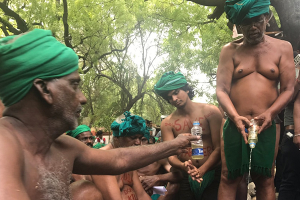 খরা ত্রাণ তহবিল থেকে ঋণ অনুমোদন এবং কৃষি ঋণ মওকুফের দাবিতে গত ৩৯ দিন ধরে কৃষকরা কখনও তাদের অর্ধেক মাথার চুল ও দাঁড়ি কামিয়ে কখনও বা ইঁদুর-সাপ খেয়ে, রাস্তায় খাবার ঢেলে খেয়ে, নগ্ন হয়ে হেঁটে, ঋণে জর্জরিত আত্মহত্যাকারী কৃষকদের মাথার খুলি নিয়ে প্রতিবাদ করে আসছেন। কিন্তু কোন কাজ হয় নি। তাই সরকারের দৃষ্টি আকর্ষন করতে শনিবার ধরনার ৪০ তম দিনে পানির বোতলে মুত্র সংগ্রহ করে তা পান করলেন কৃষকরা। পূর্ব নির্ধারিত এই প্রতিবাদী ধরনায় পুলিশি বাধা স্তত্তেও মুত্র পান থেকে থামানো যায়নি কৃষকদের।