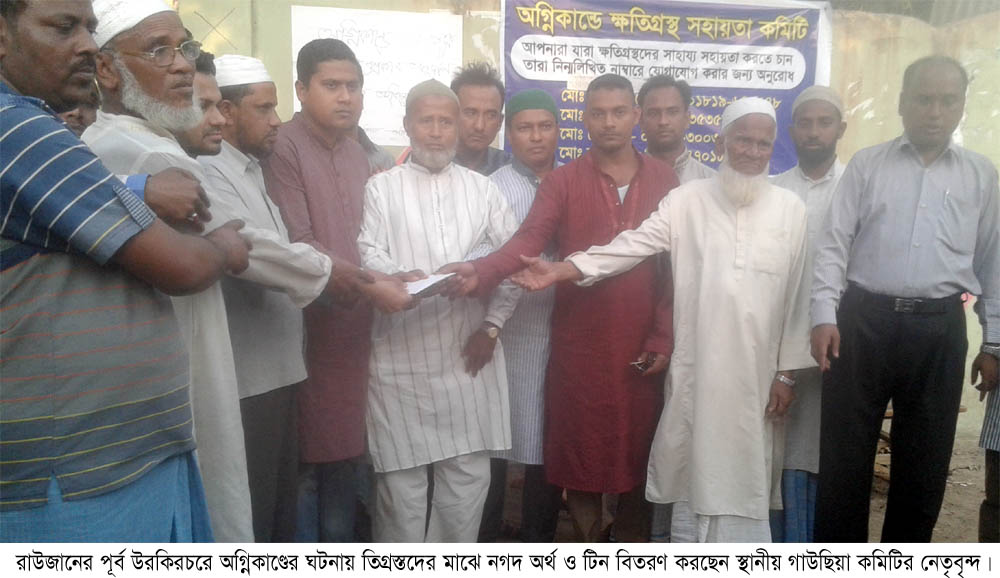 চট্টগ্রামের রাউজান পূর্ব উরকিরচর রওশান তালুকদার বাড়ীতে সম্প্রতি অগ্নিকাণ্ডের ঘটনায় ১৫ ঘর ভুষ্মিভুত হয়। এসব ক্ষতিগ্রস্তদের মাঝে গতকাল বিকালে নগদ টাকা ও ডেউটিন বিতরণ করেছেন গাউছিয়া কমিটি বাংলাদেশ উরকিরচর ইউনিয়ন শাখা ও মইশকরম ওয়ার্ড শাখা।