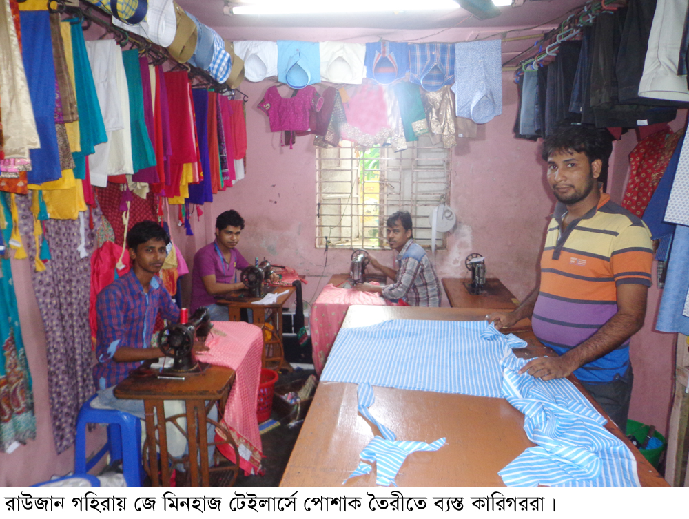 আসন্ন ঈদ-উল ফিতরকে সামনে রেখে চট্টগ্রামের রাউজান উপজেলা জুড়ে ঘুম নেই দর্জিদের। তাদের কর্ম ব্যস্ততায় নির্ঘম রাত কাটাচ্ছে। ভোর থেকে মধ্যরাত পর্যন্ত অত্যন্ত ব্যস্ত সময় পার করছেন দর্জি দোকানের কারিগররা। আধুনিকতার সাথে তাল মিলিয়ে বিভিন্ন ডিজাইনের পোষাক তৈরীতে মেতে উঠেছেন দর্জিরা। সরেজমিনে দেখা যায়, রাউজানের এলিগ্যান্ট টেইলার্স, গহিরা আরিফ মাকের্টের জে মিনহাজ টেইলার্স, মিতালী টেইলার্স, ফ্যাশন টেইলার্স, সুবর্ণা টেইলার্স, সৌদিয়া টেইলার্স, নদিমপুর সওদাগর মার্কেটের জে.ডি টেইলার্সের কারিগররা নর-নারীদের পোষাক তৈরীতে চরম ব্যস্ত সময় পার করছে। আর কয়েক দিন পর মুসলমানদের অন্যতম ধর্মীয় উৎসব ঈদ-উল ফিতর।