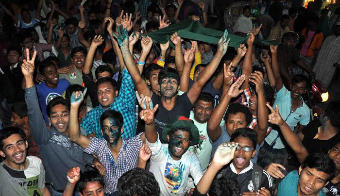 বাংলাদেশ বনাম পাকিস্তানের ক্রিকেট ম্যাচ বলে অন্যান্য দিনের তুলনায় আজকে রাজধানী ছিল টান টান উত্তেজনাময়। রাজধানীর ধানমন্ডির বিভিন্ন পয়েন্ট, কলাবাগান, রবীন্দ্র সরোবর, শাহাবাগ সহ বিভিন্ন স্থানে বসানো হয়েছিল প্রজেক্টর ও বড় বড় কালার মনিটর। যাতে করে সর্বশ্রেণীর মানুষদের জন্য খেলা দেখাটা সহজতর হয়। জয় যখন নিশ্চত হল ঠিক তখনি ক্রিকেট প্রেমিকরা তাদের আনন্দ মিছিল বের করে। রাজধানীর প্রায় জায়গাতেই চলছে এ আনন্দ মিছিল।