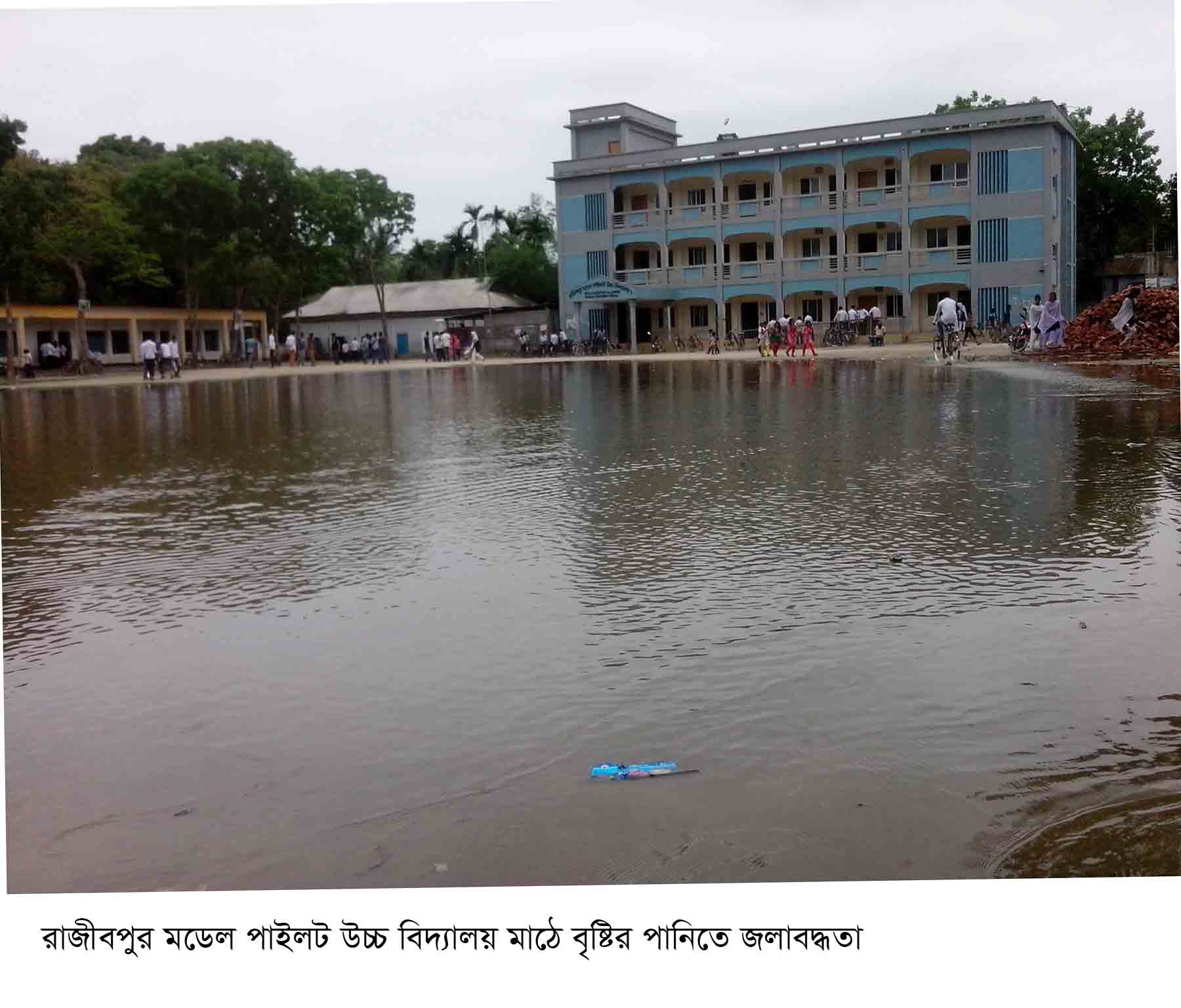 পানি নিস্কাশনে ড্রেনেজ ব্যবস্থা না থাকায় সামান্য বৃষ্টির পানিতেই জলাবদ্ধতা দেখা দেয় স্কুল মাঠে। তার ওপর বাজারের পানি গড়িয়ে জমা হয় ওই মাঠে। ফলে পুরো বর্ষার সময়ই জলাবদ্ধ অবস্থায় থাকে শিক্ষা প্রতিষ্ঠান দু’টির মাঠে। জলাবদ্ধতার ফলে সহজেই ময়লা আবর্জনায় ভরে যায়। তখন দুর্গন্ধে স্কুলে অবস্থান করা যায় না। এ চিত্র কুড়িগ্রামের রাজীবপুর মডেল পাইলট উচ্চ বিদ্যালয় ও রাজীবপুর মডেল প্রাথমিক বিদ্যালয়ের স্কুল মাঠের।