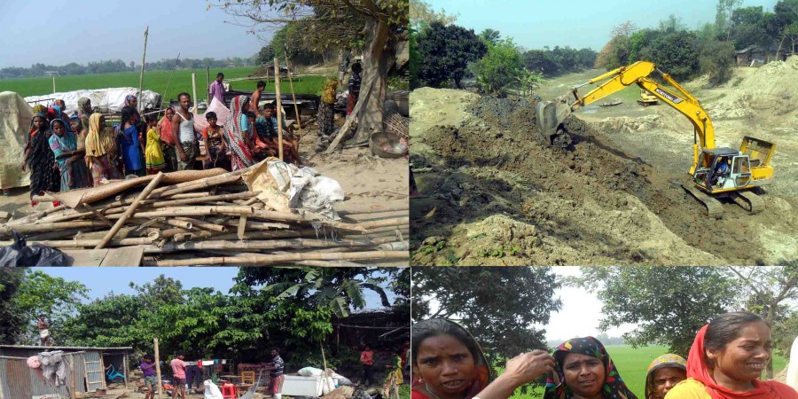 জানা গেছে, উপজেলার মিরাট ইউনিয়নের ধনুপাড়া তিন নাম্বার সুইচ গেট থেকে পানি উন্নয়ন বোর্ড হতে সদ্য হস্তান্তরিত শ্রীমতখালী খালে বরেন্দ্র বহুমুখী উন্নয়ন কর্তৃপক্ষ রাণীনগর জোনের তত্ত্বাবধানে খনন কাজের জন্য জিওবি তহবিল থেকে বরাদ্দকৃত প্রায় পৌনে দুই কোটি টাকার প্রথম গ্র“পের ৬৫ লক্ষ টাকা ব্যয়ে এক কিলোমিটার খাল খনন কাজের জন্য গত ২৮ ফেব্র“য়ারি ২০১৬ইং তারিখে রাজশাহীর লক্ষীপুর মহল্লার মেসার্স তাহ্মিদ এন্টারপ্রাইজকে খনন কাজের কার্য্য আদের্শ প্রদান করলে ঠিকাদার কর্তৃপক্ষ খনন কাজ শুরু করায় হঠাৎ পাড়া নামক স্থানে বসবাসরত অসহায় ভূমিহীনদের কোন প্রকার উচ্ছেদ নোটিশ না দিয়ে প্রায় ১শ’ ৮০টি বাড়ির মধ্যে ইতিমধ্যেই প্রায় শতাধিক ঘর-বাড়ি গুড়িয়ে দিয়ে খালের মাটি দ্বারা বাড়ির জায়গা গুলো ভরাট করে দেওয়ায় প্রায় ৬শতাধিক ক্ষতিগ্রস্ত অসহায় মানুষ খোলা আকাশের নিচে ছোট-বড় ছেলে-মেয়েদের নিয়ে তিন দিন যাবৎ মানবেতর জীবন-যাপন করছে। ওই গ্রামের অসহায় ভূমিহীনদের কান্নার আওয়াজ যেন স্থানীয় প্রশাসনের কর্তা ব্যক্তিদের কাছে পৌছাতে পারছে না বলে এখন পর্যস্ত কেউ তাদের খোঁজ-খবর নিতে আসেনি। বরেন্দ্র কর্তৃপক্ষের আগ্রাসী কর্মকান্ডে ওই গ্রামের বাসিন্দারা শেষ মহুর্তে সামান্যটুকু সম্বল রক্ষার জন্য ভয়ে-ভীতে বাধ্য হয়ে নিরাপদ স্থানে আশ্রয় নিতে হচ্ছে।