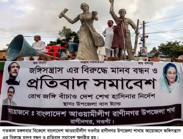 কাজী আনিছুর রহমান, রাণীনগর (নওগাঁ) : গতকাল মঙ্গলবার বাংলাদেশ আওয়ামীলীগ নওগাঁর রাণীনগর উপজেলা শাখার আয়োজনে জঙ্গিসন্ত্রাস এর বিরুদ্ধে মানব বন্ধন ও প্রতিবাদ সভা অনুষ্ঠিত হয়েছে। উপজেলা বাস স্ট্যান্ড গোলচত্বরে “রোখ জঙ্গি বাঁচাও দেশ শেখ হাসিনার নির্দেশ” শ্লোগানকে সামনে রেখে মানব বন্ধন ও প্রতিবাদ সভা অনুষ্ঠিত হয় ।