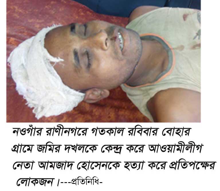 নওগাঁর রাণীনগরে মাত্র ২৫ শতক জমির দখলকে কেন্দ্র করে পায়ের গোড়ালি (কব্জি) বিচ্ছিন্ন করে এবং আরেক পায়ের রগ কেটে আওয়ামীলীগ নেতা আমজাদ হোসেন (৩৫) নামের একজনকে হত্যা করা হয়েছে।