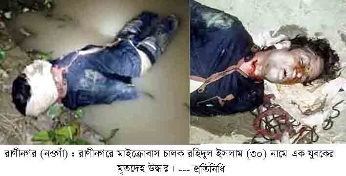 নওগাঁর রাণীনগরে মাইক্রোবাস চালক রহিদুল ইসলাম ওরফে নবির (৩০)নামে এক যুবকের মৃতদেহ উদ্ধার করেছে পুলিশ। গত সোমবার সন্ধ্যা সাড়ে ৬টার দিকে উপজেলার দেউলিয়া গ্রামের ত্রিমোহনী খালে হাত-পা-মুখ বাঁধা অবস্থায় রহিদুল ইসলামের লাশ উদ্ধার করা হয়। নিহত রহিদুল ইসলাম ওরফে নবির নওগাঁ সদর উপজেলার আরজি-নওগাঁর উপ-শেরপুর মহল্লার মৃত আক্কাস আলীর ছেলে।