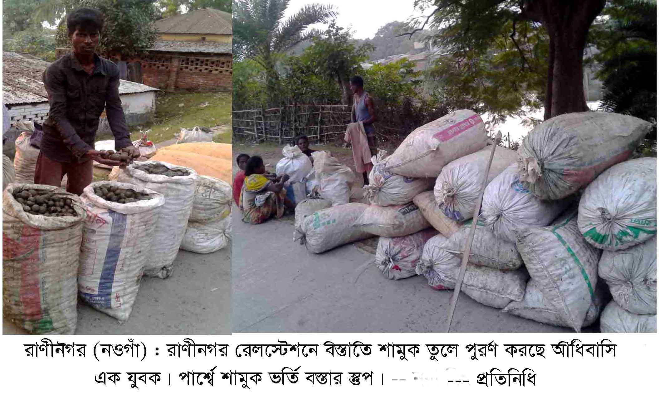 জয়পুরহাট জেলার পাঁচবিবি উপজেলার মহিপুর গ্রামের বিশ্বনাথ সরেন এর স্ত্রী নাছন টুডু (৪৩) জানান, আমার ছেলে-মেয়ে সহ আমি উত্তরা ট্রেনে রাণীনগর স্টেশনে সকালে নেমে আরও কয়েক জন দলবদ্ধ হয়ে বিলে শামুক তুলতে যাই। সূর্য ডোবার আগে প্রতিজনার দুই বস্তা শামুক হলেই ভ্যানে তুলে স্টেশনে নিয়ে এসে রকেট মেইল যোগে বাড়িতে চলে যাই। আমরা তিন জন মিলে প্রতিদিন প্রায় ৪হাজার টাকার শামুক বিক্রয় করি।