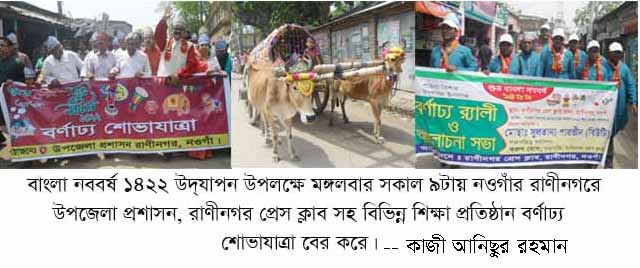 নওগাঁর রাণীনগর প্রেস ক্লাবের উদ্যোগে উদযাপন করা হলো পহেলা বৈশাখ । প্রতি বছরের মতো এবারও জাক-জমকপূর্ন আয়োজনের মধ্য দিয়ে বরণ করা হয় বাংলা ১৪২২ বঙ্গাব্দ।
