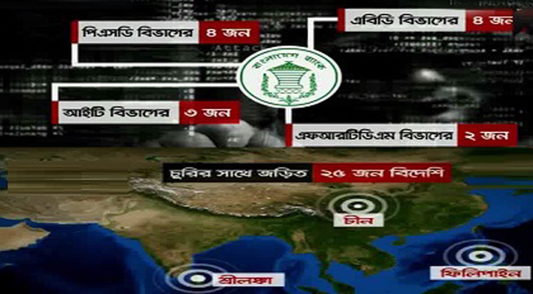 বাংলাদেশ ব্যাংকের রিজার্ভ চুরির সাথে কেন্দ্রীয় ব্যাংকের চার বিভাগের অন্তত ১৩ জন কর্মকর্তার সংশ্লিষ্টতার প্রমাণ পেয়েছে তদন্ত সংস্থা সিআইডি। তাদের বিরুদ্ধে ব্যবস্থা নেওয়ার প্রক্রিয়াও চলছে। এছাড়া ফিলিপাইন, শ্রীলংকা, চীন ও সিঙ্গাপুরের ২৫ নাগরিককে চিহ্নিত করেছে সিআইডি।