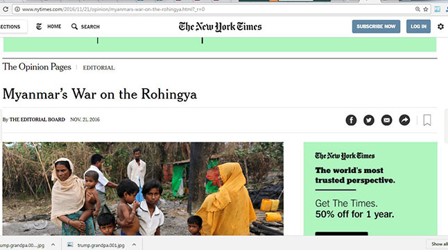 সে যাই হোক বিশ্বের মোড়ল মিডিয়াতে এ নিয়ে প্রতিবেদন প্রকাশ শুরু করেছে। মার্কিন যুক্তরাষ্ট্রের প্রভাবশালী পত্রিকা দ্য নিউইয়র্ক টাইমস ২১ নভেম্বর (সোমবার) একটি সম্পাদকীয় প্রকাশ করেছে। এর শিরোনামে বলা হয়েছে, ‘রোহিঙ্গাদের উপর যুদ্ধ চালাচ্ছে মিয়ানমার’। যারা সন্দেহ করছিলেন বা যারা মনে করেছিলেন রোহিঙ্গা নিধনের খবরটি সঠিক নয় তারা এ সম্পাদকীয়টি পড়তে পারেন। দ্য নিউইয়র্ক টাইমস্ও ধোয়া তুলসী পাতা না হলেও একটি প্রভাবশালী গণমাধ্যম হিসেবে বিশ্বজুড়ে স্বীকৃত।