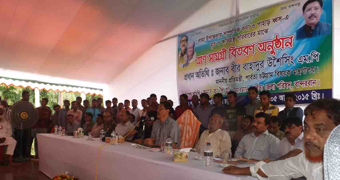 বুধবার ৫ আগষ্ট লামা উপজেলা পরিষদের চত্বরে সাম্প্রতিক সময়ে লামা উপজেলায় ভয়াবহ পাহাড় ধস, তিনবারের বন্যায় ক্ষতিগ্রস্থদের মাঝে নগদ টাকা, ঢেউটিন, চাউল ও সোলার বিতরণ করা হয়েছে। অনুষ্ঠানে প্রধান অতিথি হিসেবে উপস্থিত ছিলেন পার্বত্য চট্টগ্রাম বিষয়ক মন্ত্রণালয়ের প্রতিমন্ত্রী বীর বাহাদুর উশৈসিং এমপি। জেলা পরিষদের সদস্য জহিরুল ইসলাম এর সঞ্চালনায় ত্রাণ বিতরণ অনুষ্ঠানে সভাপতিত্ব করেন লামা উপজেলা নির্বাহী অফিসার খালেদ মাহমুদ। এতে বিশেষ অতিথি হিসেবে উপস্থিত ছিলেন, সহকারী জেলা প্রশাসক (রাজস্ব) হারুণ অর রশীদ, বান্দরবান পুলিশ সুপার মিজানুর রহমান, আলীকদম সেনা জোনের মেজর মোঃ আরিফ হাসান(টুআইসি), এলজিইডি জেলা নির্বাহী প্রকৌশলী, জেলা আওয়ামীলীগের সহ-সভাপতি ও সাবেক লামা উপজেলা চেয়ারম্যান আলহাজ্ব মোহাম্মদ ইসমাইল, লামা উপজেলা পরিষদের চেয়ারম্যান থোয়াইনু অং চৌধুরী, লামা পৌরসভা মেয়র আমির হোসেন, জেলা আওয়ামী লীগের সহ-সভাপতি রহিম চৌধুরী, সহ-সভাপতি ইসলাম বেবী, জেলা আওয়ামী লীগের যুগ্ন সাধারণ সম্পাদক ও জেলা পরিষদ সদস্য লক্ষিপদ দাস, জেলা পরিষদ সদস্য টিং টিং মার্মা, ফাতেমা পারুল, উপজেলা আওয়ামী লীগ সাধারণ সম্পাদক বাথোয়াইচিং মার্মা সহ প্রমূখ।