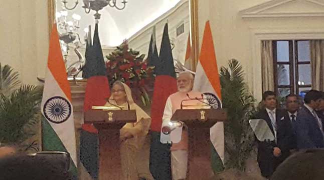 শীর্ষ বৈঠক শেষে যৌথ সংবাদ সম্মেলন করেন দু’দেশের প্রধানমন্ত্রী। শেখ হাসিনা লিখিত বক্তব্যে বলেন, ‘ভারত আমাদের সবচেয়ে কাছের ও গুরুত্বপূর্ণ প্রতিবেশী বন্ধু রাষ্ট্র। একই সঙ্গে আমাদের উন্নয়নের অংশীদার। আমাদের স্বাধীনতা যুদ্ধে ভারত গুরুত্বপূর্ণ অবদান রেখেছে এ কারণে আমরা চিরকৃতজ্ঞ। ১৯৭১ সালে আমাদের স্বাধীনতা যুদ্ধে যে ভারতীয় সৈন্যরা শহীদ হয়েছিলেন তাদের প্রতি শ্রদ্ধা জানাব বিকেলে। ১৯৭১ সালের গণহত্যার আন্তর্জাতিক সম্প্রদায়ের স্বীকৃতি পেতে ভারতের সাহায্য চাই। ভারত সরকার আমাদের সাহায্য করতে রাজি আছে।’