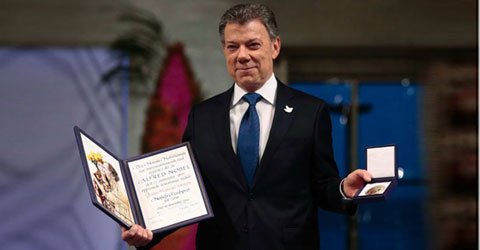 কলম্বিয়ার প্রেসিডেন্ট জুয়ান ম্যানুয়াল স্যান্তোসের হাতে শনিবার শান্তির নোবেল পুরস্কার তুলে দেয়া হয়েছে। পুরস্কার নেয়ার পর তিনি বলেছেন, এই পুরস্কার দেশে অর্ধ-শতক ধরে চলমান গৃহযুদ্ধ অবসানের ‘অসম্ভব স্বপ্ন’ বাস্তবায়নে সহায়তা করবে।
