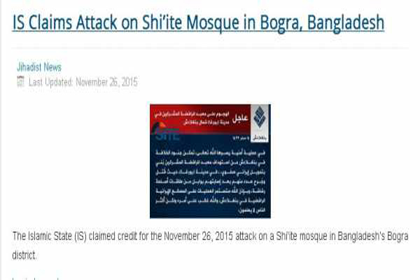 জেলার শিবগঞ্জ উপজেলায় শিয়া মসজিদে হামলার ঘটনার দায়ও ‘স্বীকার’করেছে মধ্যাপ্রাচ্যভিত্তিক জঙ্গি সংগঠন ইসলামিক স্টেট (আইএস)। বিভিন্ন জঙ্গি সংগঠনের ইন্টারনেটভিত্তিক তৎপরতা নজরদারির যুক্তরাষ্ট্রভিত্তিক ওয়েবসাইট ‘সাইট ইন্টেলিজেন্স গ্রুপ’ এমনটাই বলছে। ওয়েবসাইটটি বৃহস্পতিবার আইএসের এই দাবির কথা জানায়।