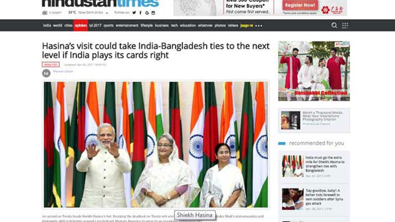 টাইমস অব ইন্ডিয়া এ সফরকে নিয়ে বিশ্লেষণী নিবন্ধ প্রকাশ করেছে। জনপ্রিয় এনডিটিভি’র অনলাইন সংস্করণেও প্রধান প্রতিবেদন ছিল শেখ হাসিনার সফর। আরেক প্রভাবশালী পত্রিকা দ্য হিন্দুতেও হাসিনা-মোদির সাক্ষাৎ ছাড়া এবং অন্যান্য বিষয় উঠে এসেছে।