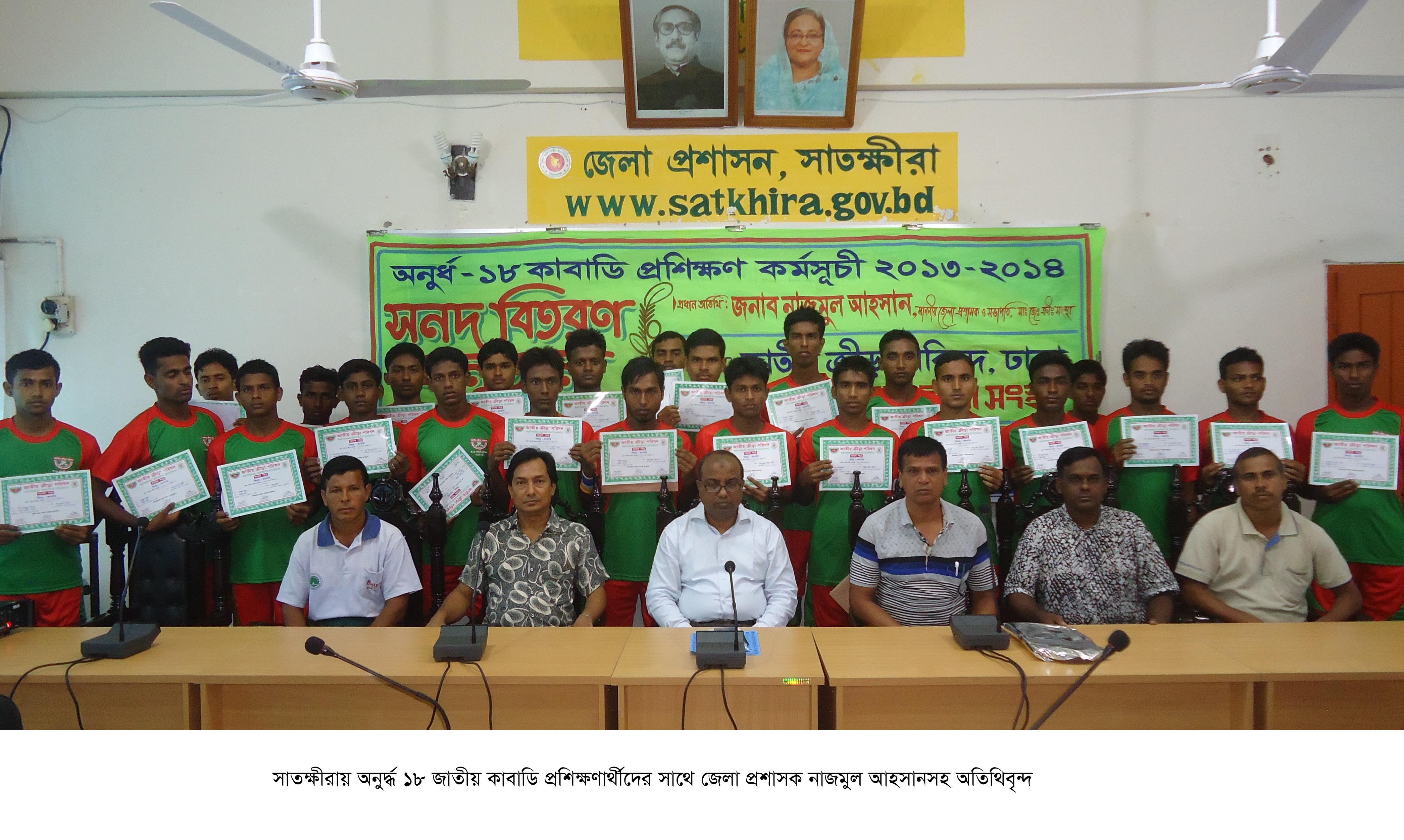 সাতক্ষীরায় অনুর্দ্ধ ১৮ জাতীয় কাবাডি প্রশিক্ষণ কর্মসূচি ২০১৩-১৪ শেষে সনদ প্রদান করা হয়েছে। বুধবার দুপুর সাড়ে ১২টায় সাতক্ষীরা জেলা প্রশাসকের সম্মেলন কক্ষে জাতীয় ক্রীড়া পরিষদের আয়োজনে ও সাতক্ষীরা জেলা ক্রীড়া সংস্থার ব্যবস্থাপনায় এ সনদ বিতরণ অনুষ্ঠানে প্রধান অতিথি হিসেবে বক্তব্য রাখেন জেলা প্রশাসক ও জেলা ক্রীড়া সংস্থার সভাপতি নাজমুল আহসান।