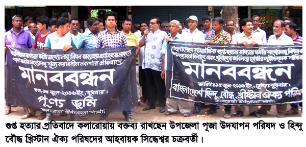কামরুল হাসান, কলারোয়া : সাতক্ষীরার কলারোয়ায় বাংলাদেশে সাম্প্রতিক গুপ্তহত্যর মাধ্যমে র্ধর্মীয় সংখ্যালঘু নিধন ও সকল গুপ্ত হত্যার প্রতিবাদে খুনিদের অবিলম্বে গ্রেফতার ও দৃষ্ঠান্তমুলক শাস্তির দাবিতে মানব বন্ধন কর্মসূচি পালন করেছে। কলারোয়া উপজেলা হিন্দু বৌদ্ধ খ্রীষ্টান ঐক্য পরিষদ ও অংগ সংগঠনের আয়োজনে এ মানব বন্ধন কর্মসূচি পালিত হয়।