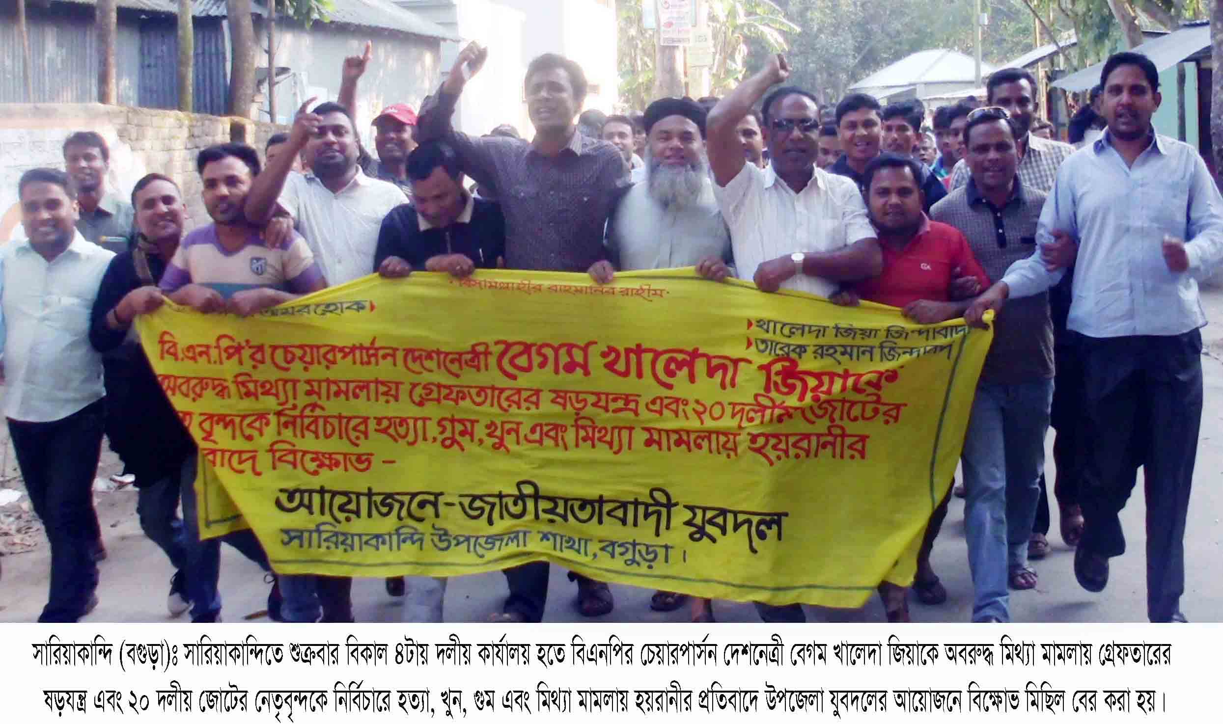 বিএনপির চেয়ারপার্সন দেশনেত্রী বেগম খালেদা জিয়ার অবরুদ্ধ মিথ্যা মামলায় গ্রেফতারের ষড়যন্ত্র এবং ২০ দলীয় জোটের নেতৃবৃন্দকে নির্বিচারে হত্যা, গুম, খুন এবং মিথ্যা মামলায় হয়রানীর প্রতিবাদে বিক্ষোভ মিছিল ও সমাবেশ অনুষ্ঠিত হয়েছে।