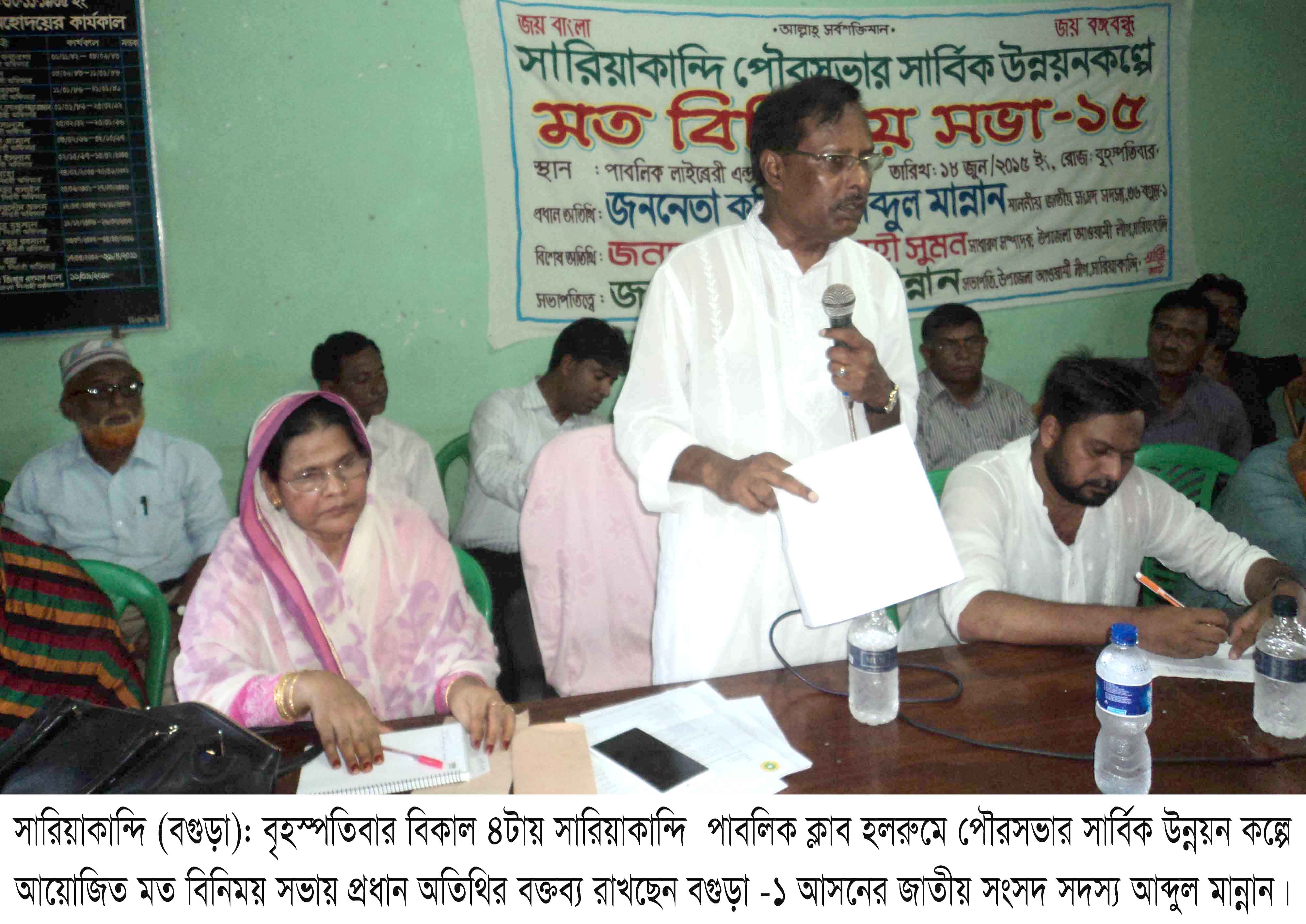 সারিয়াকান্দি পৌর সভার সার্বিক উন্নয়নের লক্ষে নাগরিকদের সহিত মত বিনিময় সভায় মিলিত হন আব্দুল মান্নান এমপি। বৃহস্পতিবার বিকাল ৪টায় সারিয়াকান্দি পাবলিক ক্লাব এন্ড লাইব্রেরী হলরুমে অনুষ্ঠিত মত বিনিময় সভায় সভাপতিত্ব করেন উপজেলা আওয়ামীলীগের সভাপতি এমপি পত্নী সাহাদারা মান্নান।