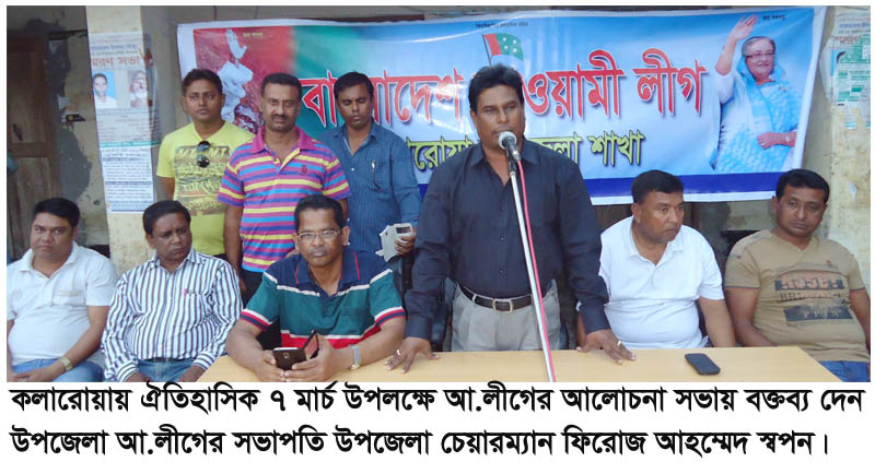 ঐতিহাসিক ৭ মার্চ উপলক্ষে কলারোয়ায় আ.লীগ আয়োজিত আলোচনা সভায় কথাগুলো বলছিলেন উপজেলা আ.লীগের তরুন সভাপতি ও উপজেলা চেয়ারম্যান ফিরোজ আহম্মেদ স্বপন। শনিবার বিকেলে উপজেলা পরিষদ চত্বরে আয়োজিত সভায় সভাপতির বক্তব্যে ফিরোজ আহম্মেদ স্বপন আরও বলেন, বঙ্গবন্ধুর ৭ মার্চ এর ভাষন ছিলো স্বাধীনতার সুস্পষ্ট ঘোষণা, এটি ঐতিহাসিক সনদ।