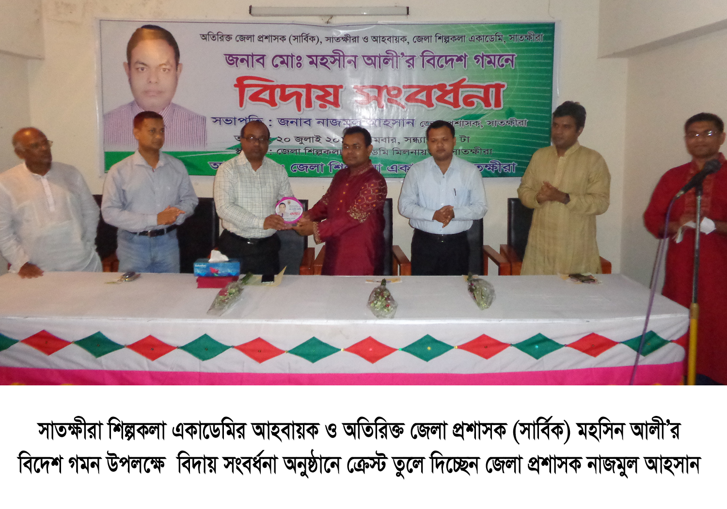 সাতক্ষীরা শিল্পকলা একাডেমির আহবায়ক ও অতিরিক্ত জেলা প্রশাসক (সার্বিক) মহসীন আলী’র বিদেশ গমন উপলক্ষে বিদায় সংবর্ধনা প্রদান ও সাংস্কৃতি অনুষ্ঠান অনুষ্ঠিত হয়েছে। গতকাল সোমবার সন্ধ্যা সাড়ে ৭টায় জেলা শিল্পকলা একাডেমির আয়োজনে একাডেমি মিলনায়তনে এ বিদায় সংবর্ধনা অনুষ্ঠানে সভাপতিত্ব করেন জেলা প্রশাসক নাজমুল আহসান। অনুষ্ঠানের শুরুতে স্বাগত বক্তব্য রাখেন জেলা শিল্পকলা একাডেমির সদস্য সচিব শেখ মুশফিকুর রহমান মিল্টন। অনুষ্ঠানে বিদায়ী অতিথি’র কর্মজীবন সম্পর্কে ‘হৃদয়ে হৃদয়ে রেখেছি তোমারে … আমাদের প্রিয় মোঃ মহসীন আলী’ শীর্ষক একটি ভাজপত্র পাঠ করেন কষ্ঠশিল্পী শামীমা পারভীন রত্মা। সংবর্ধনা অনুষ্ঠানে বক্তব্য রাখেন নবাগত অতিরিক্ত জেলা প্রশাসক (সার্বিক) এ.এফ.এম এহতেশামুল হক, অতিরিক্ত পুলিশ সুপার মীর মোদদাছছের হোসেন, সদর উপজেলা নির্বাহী অফিসার শাহ্ আব্দুল সাদী, সাতক্ষীরা কমার্স কলেজের অধ্যক্ষ প্রফেসর আব্দুল হামিদ, জেলা ক্রীড়া সংস্থার সাধারণ সম্পাদক শেখ নিজাম উদ্দীন, রেড ক্রিসেন্ট সাতক্ষীরা ইউনিটের সেক্রেটারী শেখ নুরুল হক, কষ্ঠশিল্পী আবু আফফান রোজবাবু, জেলা সাংস্কৃতিক পরিষদের সাধারণ সম্পাদক হেনরী সরদার প্রমুখ। অনুষ্ঠানে জেলা প্রশাসক নাজমুল আহসান জেলা শিল্পকলা একাডেমির আহবায়ক ও অতিরিক্ত জেলা প্রশাসক (সার্বিক) মহসীন আলী’র হাতে সংবর্ধনা ক্রেস্ট তুলে দেন। এসময় উপস্থিত ছিলেন এনডিসি আবু সাঈদ, নির্বাহী ম্যাজিষ্ট্রেট বিষ্ণপদ পাল, শিল্পী ও শিক্ষক মঞ্জুরুল হক, ফারহা দিবা খান সাথী, পল্টু বাশার, মনিরুজ্জামান ছট্রু, ছিদ্দিকুর রহমান, আব্দুর রহমান, মনিরুজ্জামান মুন্না প্রমুখ। সমগ্র অনুষ্ঠান পরিচালনা করেন জেলা শিল্পকলা একাডেমির সদস্য সচিব শেখ মুশফিকুর রহমান মিল্টন।