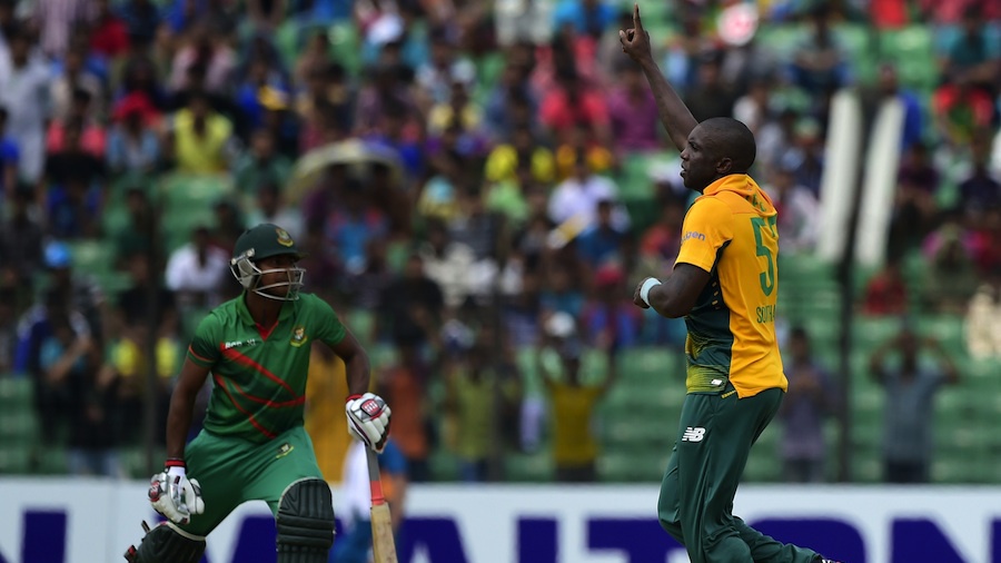 জয়ের লক্ষ্যে ব্যাট করতে নেমে শুরুতেই উইকেট হারায় বাংলাদেশ। কাইল অ্যাবোটের করা প্রথম ওভারের শেষ বলে আউট হন তামিম (৫)। এরপর রাবাদার করা দ্বিতীয় ওভারের পঞ্চম বলে ডুমিনির হাতে ক্যাচ দিয়ে আউট হন সৌম্য সরকার (৭)। দলীয় ৫০ রানে ডুমিনির বলে উড়িয়ে মারতে গিয়ে মিলারের হাতে ধরা পরেন মুশফিক (১৭)। ডুমিনির করা দশম ওভারের দ্বিতীয় বলে কুইনটন ডি ককের হাতে ধরা পরেন সাব্বির রহমান। নতুন ব্যাটসম্যান নাসির হোসেনও বেশিক্ষণ টিকতে পারেননি।