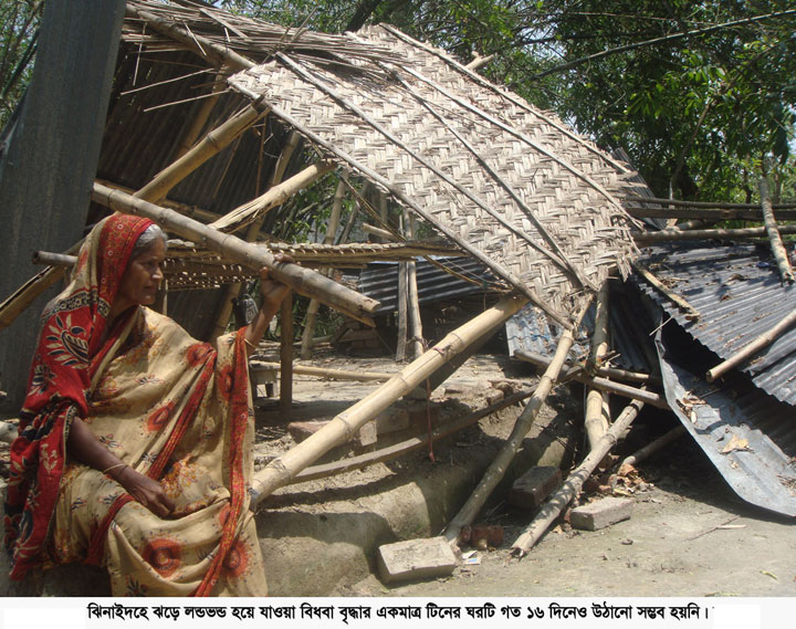 ঝড়ে লন্ডভন্ড হয়ে গেছে বৃদ্ধা জামেনা খাতুনের। চোখের কোনায় পানি নিয়ে ৬২ বছরের বিধবা জামেনা খাতুন বললেন আর মনে হয় কখনও নিজ ঘরে ফিরতে পারবো না। নিঃসন্তান জামেনা খাতুনের মাথা