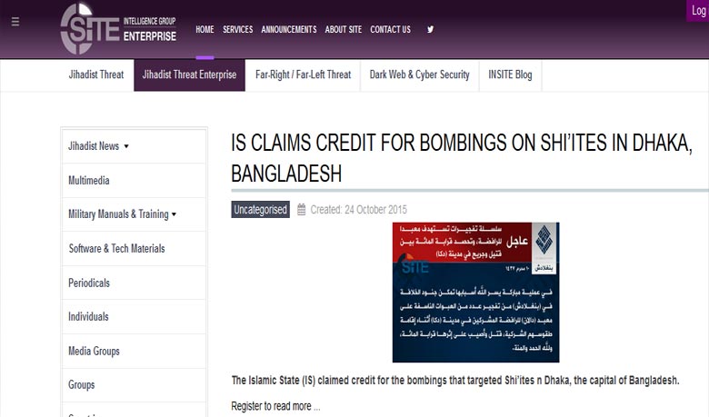 পুরান ঢাকার হোসেনি দালানের সামনে মহররম উপলক্ষে শিয়াদের তাজিয়া মিছিলের প্রস্তুতিকালে বোমা হামলার ঘটনার দায় স্বীকার করেছে ইসলামিক স্টেট (আইএস)। শনিবার যুক্তরাষ্ট্রভিত্তিক ওয়েবসাইট সার্চ ফর ইন্টারন্যাশনাল টেররিস্ট এনটিটিস (এসআইটিই) এ