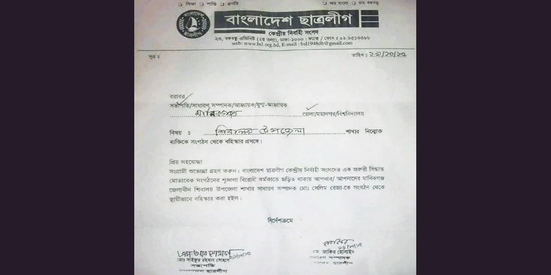 মানিকগঞ্জ জেলার শিবালয়ে উপজেলা ছাত্রলীগ সম্পাদক বহিষ্কার