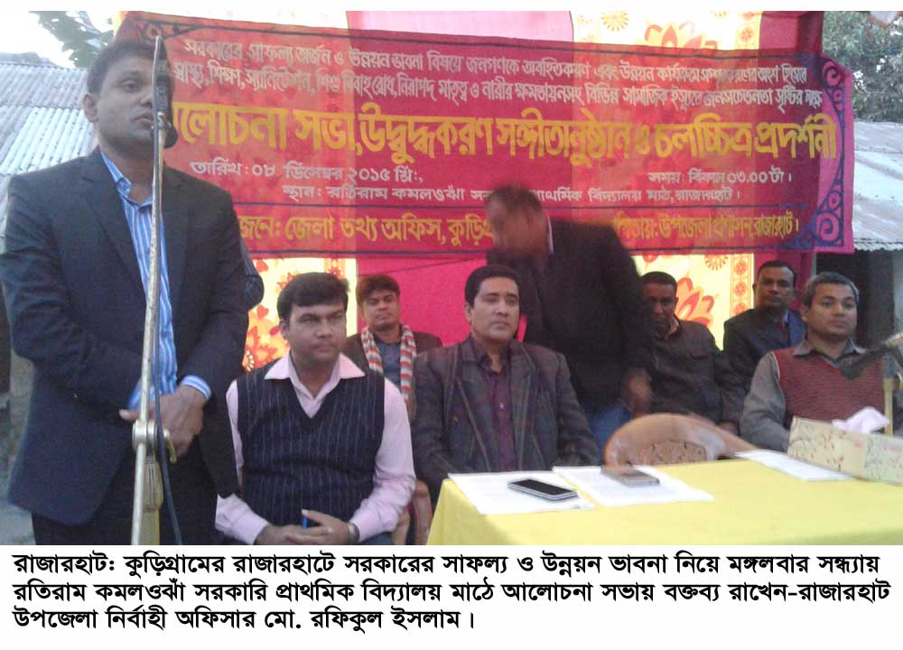 কুড়িগ্রাম জেলা তথ্য অফিসের উদ্যোগে এবং রাজারহাট উপজেলা প্রশাসনের সহযোগিতায় সরকারের সাফল্য অর্জন ও উন্নয়ন ভাবনা বিষয়ে জনগণকে অবহিতকরণ এবং উন্নয়ন কার্যক্রমে সম্পৃক্ত করণের লক্ষ্যে আলোচনা সভা উদ্বুদ্ধকরণ সংগীতানুষ্ঠান ওবিস্তারিত