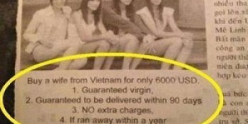 অদ্ভুত এক বিজ্ঞাপনের খোঁজ পাওয়া গেলো ভিয়েতনামের সংবাদপত্রে। যে বিজ্ঞাপনে লেখা হয়েছে মাত্র ৬ হাজার মার্কিন ডলারে যে কেউ স্ত্রী কিনতে পারবেন! অবশ্যই কুমারী (ভার্জিন)। পণ্য সরবরাহের ঢঙে ডলার জমা