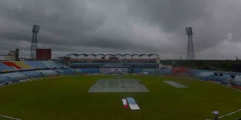 প্রায় টানা এক ঘণ্টা ১০ মিনিট পর সন্ধ্যা সাড়ে সাতটায় থেমেছে বৃষ্টি। এরপর মাঠের মধ্যে প্রবেশ করেছেন কিউরেটর গামিনি সিলভা ও অন্যান্য গ্রাউন্ডসম্যানরা। খেলার মাঠকে উপযোগী করার কাজে লেগে গেছেন।