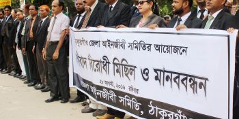 শরিফুল ইসলাম, ঠাকুরগাঁও প্রতিনিধি : ঠাকুরগাঁও জেলা আইনজীবী সমিতির আয়োজনে জঙ্গীবাদ বিরোধী মিছিল ও মানব বন্ধন অনুষ্ঠিত হয়েছে। রবিবার সকালে ঠাকুরগাঁও শহরের জর্জ কোর্ট চত্বর থেকে মিছিলটি শহরের বিভিন্ন সড়ক