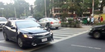 সোমবার সকাল সাড়ে দশটায় হাইকোর্ট সংলগ্ন মৎস ভবনের সামনে থেকে তোলা ছবি। এতে দেখা যাচ্ছে পতাকাবাহী একটি গাড়ি রাস্তার উল্টো পাশ দিয়ে যাচ্ছে। সামনে প্রটোকল দিয়ে নিয়ে যাচ্ছে পুলিশ। দায়িত্বরত