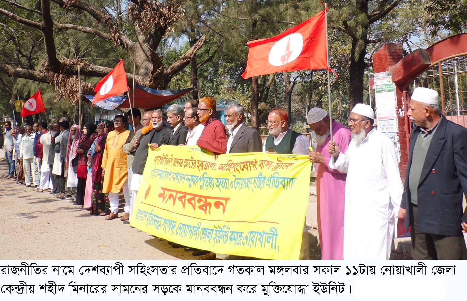 দেশব্যাপী সহিংসতার প্রতিবাদে নোয়াখালীতে মুক্তিযোদ্ধাদের মানববন্ধন-সমাবেশ