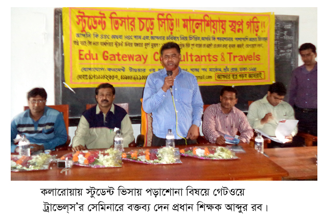 মালয়েশিয়ায় স্টুডেন্ট ভিসার মাধ্যমে স্বল্প খরচে গড়াশোনা করার সুযোগ প্রদানের প্রতিশ্রুতিতে কাজ করছে ঢাকাভিত্তিক একটি ট্রাভেলস প্রতিষ্ঠান। গত ২১ ফেব্রুয়ারি কলারোয়া পাইলট হাইস্কুলে এডু গেইটওয়ে কনসালটেন্টস্ এন্ড ট্রাভেল্স নামের এবিস্তারিত