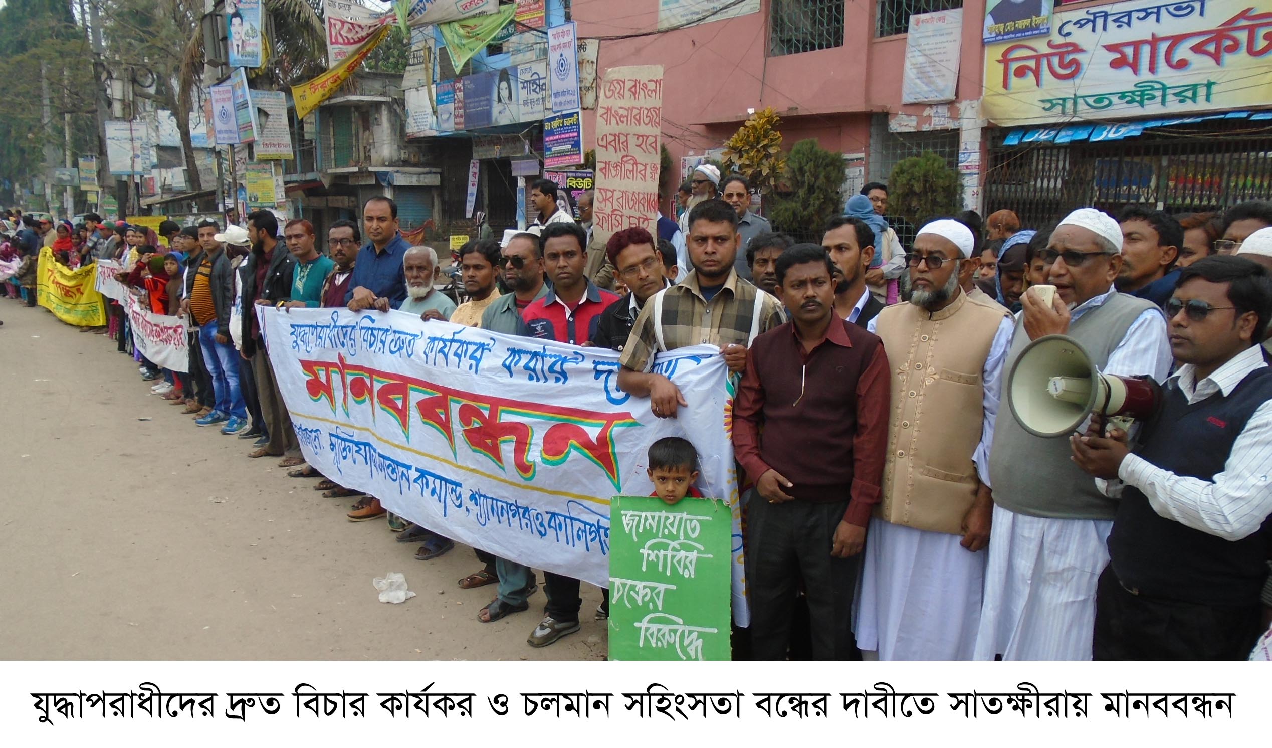 যুদ্ধাপরাধীদের দ্রুত বিচার কার্যকর ও চলমান সহিংসতা বন্ধের দাবীতে সাতক্ষীরায় মানববন্ধন কর্মসূচী পালিত