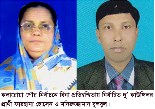 কলারোয়া পৌর নির্বাচনে দু’জন কাউন্সিলর প্রার্থী বিনা প্রতিদ্বন্দ্বিতায় নির্বাচিত হয়েছেন। ১নং সংরক্ষিত আসনের মহিলা কাউন্সিলর প্রার্থী আ.লীগ সমর্থিত ফারহানা হোসেন ও ২নং সাধারণ আসনের কাউন্সিলর প্রার্থী আ.লীগ সমির্থত মনিরুজ্জামান বুলবুলেরবিস্তারিত