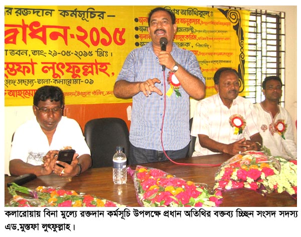 সাতক্ষীরার কলারোয়ায় বিনামুল্যে রক্তদান কর্মসূচি উদ্বোধন করেছেন তালা-কলারোয়ার সংসদ সদস্য এড.মুস্তফা লুৎফুল্লাহ। এ উপলক্ষ্যে বৃহস্পতিবার বেলা ১২ টায় পৌরসভা অডিটোরিয়ামে আয়োজিত অনুষ্ঠানে বিনামূল্যে রক্তদান কর্মসূচির উদ্বোধন করেন তালা-কলারোয়ার সংসদ সদস্যবিস্তারিত