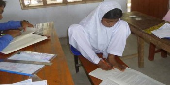 পা দিয়ে লিখে জেএসসি পরীক্ষা দিচ্ছে বিউটি